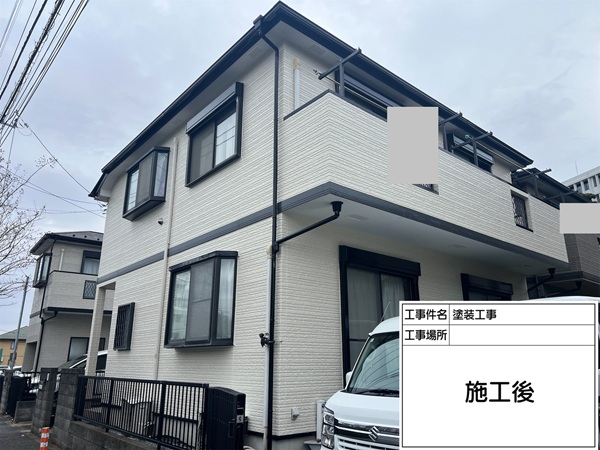 施工前のくすんだグレーから、清潔感あふれる外壁へと変化し、建物全体の雰囲気がグッと明るくなりました。